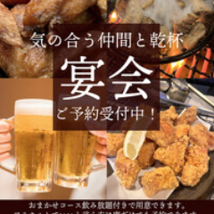 鮮度抜群の国産鶏、宮崎名物の炭火焼きと利き酒師厳選の地酒をお楽しみください。日本酒15種が付いたプレミアム飲み放題付きコース5,500円(税込)~ご用意しております