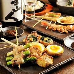 【名物の野菜肉巻き串と多彩な串焼き。玄関をくぐると高揚感を覚える吹き抜け空間】