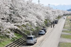 弁天緑地と、残雪の加越国境の山並にマッチした桜並木が美しい。九頭竜川のそよ風にふかれながらの花見は最高。桜が満開の4月上旬~中旬頃には、売店が出る弁天桜まつりが開催される。また、弁天桜まつりの前後1週間はぼんぼりが灯り、風情ある夜桜を楽しむことができる。4月上旬より九頭竜川を横断して掲げられる鯉のぼりとの共演も見所。