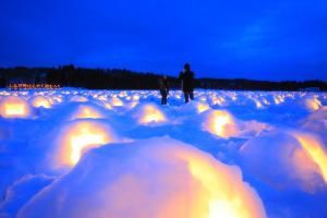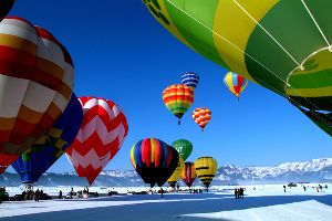 真っ白な雪原にカラフルな熱気球が浮かぶ