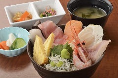 ◆JR熱海駅直結「ラスカ熱海」の3階 ◆新鮮な地場の魚介を食べ尽くす! ◆お手頃価格の定食、丼、郷土料理 ◆静岡麦酒や種類豊富な地酒♪ ◆舟盛り定食1,980円(税抜)